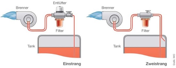 Die Ölpumpe am Brenner zieht wesentlich mehr Öl an, als für die Verbrennung benötigt wird. Daher wird ein Rücklauf benötigt. Beim Zweistrangsystem läuft das nicht benötigte Öl in den Tank zurück (siehe rechtes Bild), beim Einstrangsystem läuft das Öl nur noch bis zum Entlüfter (auch LUB genannt) zurück. Diese Art hat eigentlich nur Vorteile, abgesehen von den Anschaffungskosten des Entlüfters/Lubs und die Umbaukosten.